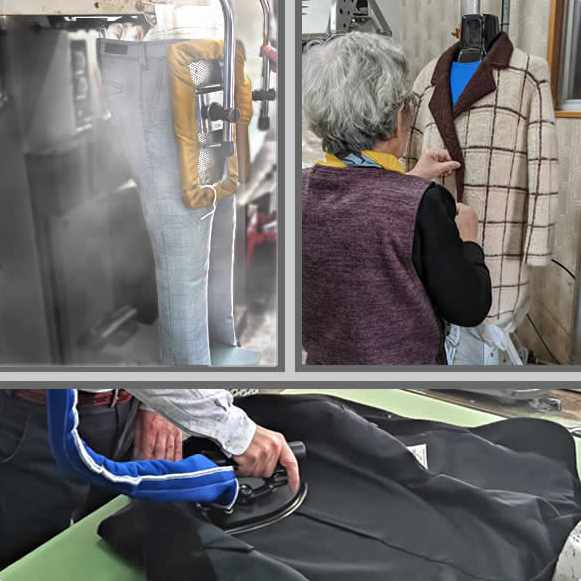 衣類の種類別に用意している各種プレス機械を使ったり、豊かな経験を持つベテランによる手仕上げをアイテムに合わせて使い分けています。