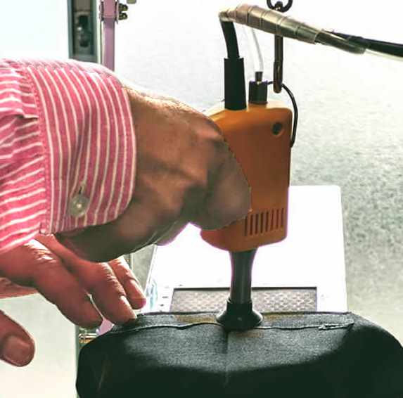 襟や脇、ポケット回りなど汚れがちな箇所は、洗浄液を超音波振動でなじませ、汚れが落ちやすい状態にしておきます。また、場合によっては洗う前にシミ抜きしておきます。